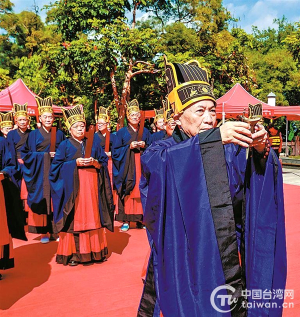 鼓初嚴、鼓再嚴、鼓三嚴。伴隨著雄渾深沉的鼓聲響起,主祭官浴手、迎神、宣讀祭文,帶領兩岸民眾代表莊重地進行三獻禮等流程,完成了一場莊嚴肅穆的尊古頌典儀式。