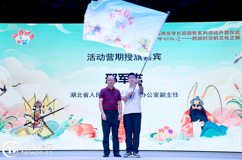 湖北省臺辦副主任邢軍志為兩岸學長代表授旗。(中國臺灣網發)