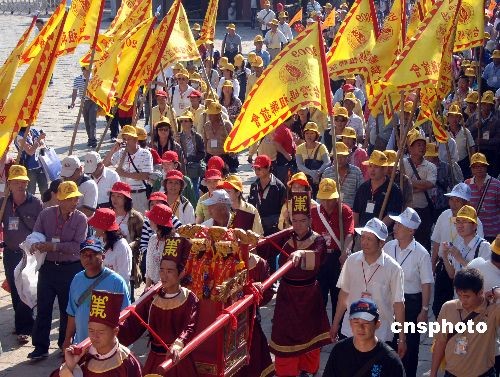 5月15日下午,360名臺灣媽祖信眾進香團成員步行前往莆田湄洲島媽祖祖廟謁祖進香。當日,搭載他們的“海洋拉拉號”客貨輪從臺灣臺中直航抵達福建湄洲港客運碼頭,實現臺中港與湄洲港首次客運直航。 中新社發 劉可耕 攝