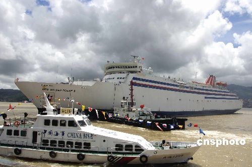 7月13日上午,福州首航臺灣基隆港的“新金橋Ⅱ號”豪華客輪在海事船的引領下緩緩離開馬尾客運碼頭。當日,630名旅客乘坐“新金橋Ⅱ號”客輪從福州馬尾客運碼頭直航臺灣基隆港,開始為期6到8天的臺灣寶島游。這是大陸直航臺灣本島的第一艘客輪,標志著繼去年12月15日海峽兩岸貨運直航之后,兩岸的客運直航也終于實現。 中新社發 王東明 攝