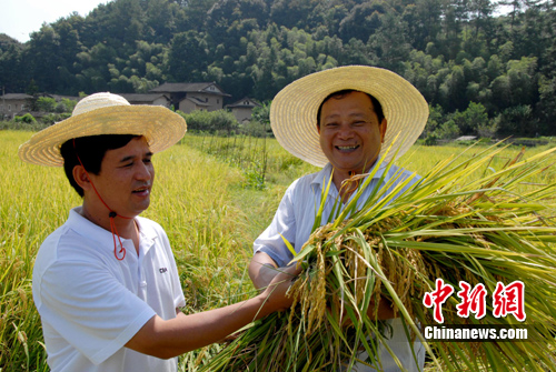 8月11日,臺灣客商劉佑麟(右)與福建省永定縣農業專家望著沉甸甸的臺灣“仙光米”稻谷露出了開心的笑容。(劉永良 攝)
