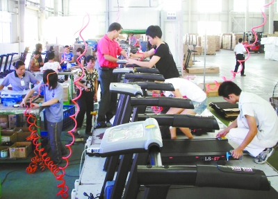 臺(tái)企立和(漳州)實(shí)業(yè)有限公司新增兩條電動(dòng)跑步機(jī)組裝生產(chǎn)線,預(yù)計(jì)投產(chǎn)后年產(chǎn)值可增加2000萬元以上。圖為工人們正在檢測(cè)包裝一批即將出口的跑步機(jī)。(陳毅聰 攝)