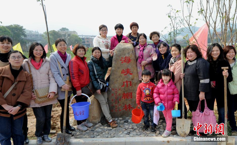 3月14日,福建省婦聯、福州市婦聯、福州市臺聯等聯合組織兩岸姐妹在福州閩侯縣白沙鎮孔元村開展“弘揚生態文明 、共建美麗家園--各界婦女共植‘海峽巾幗林’活動”,在榕機關干部、臺胞臺屬代表、“巾幗文明崗”、優秀女性、環保文明家庭代表等海峽兩岸姐妹共140人參加了該義務植樹活動共同植下碧桃、紅千層等樹苗500多株。圖為參加該植樹活動的兩岸姐妹在“海峽巾幗林”石碑前合影。