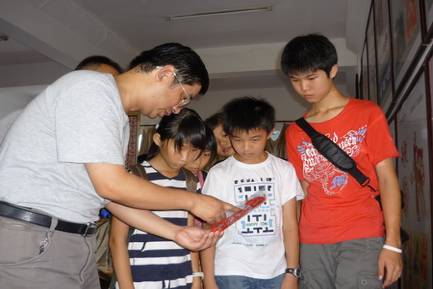 圖:講解員給臺灣小朋友講解孝感雕花。