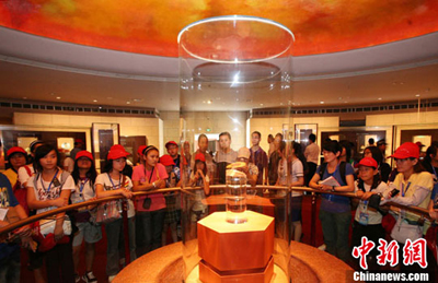 圖為成都金沙遺址博物館內的“太陽神鳥”吸引臺灣學生。中新社發 劉忠俊 攝