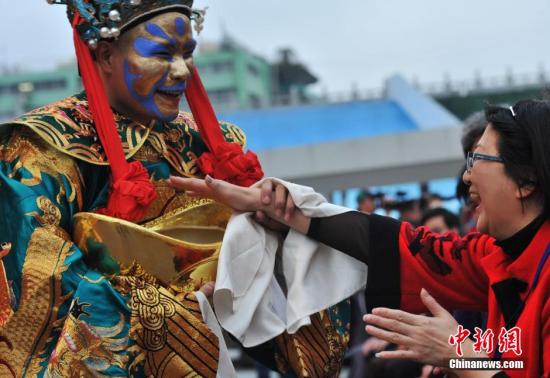 2月7日晚,北京地壇廟會(huì)的臺(tái)北之旅,借助臺(tái)北燈節(jié)今夜開幕良機(jī)在花博公園登場,舞者扮作傳統(tǒng)財(cái)神,請(qǐng)女嘉賓摸金元寶祈望發(fā)財(cái)。賈國榮 攝
