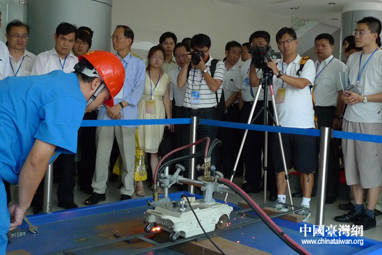 在研發(fā)出世界第一臺磁懸風(fēng)力發(fā)電機(jī)的深圳泰瑪風(fēng)光能源科技有限公司,臺灣代表就饒有興致地與泰瑪公司總經(jīng)理討論起了如何降低風(fēng)力發(fā)電的成本問題;在華南地區(qū)最大的新型清潔環(huán)保能源二甲醚生產(chǎn)基地——廣州久泰能源有限公司的廠區(qū)內(nèi),代表們現(xiàn)場觀看了用二甲醚切割鐵板的演示,并了解了二甲醚的整個(gè)生產(chǎn)過程;在臺資企業(yè)廣州聯(lián)眾不銹鋼有限公司,通紅的鋼材蒸騰出灼熱的氣體,透過玻璃窗,熱軋生產(chǎn)線的整個(gè)作業(yè)過程展現(xiàn)在代表面前。