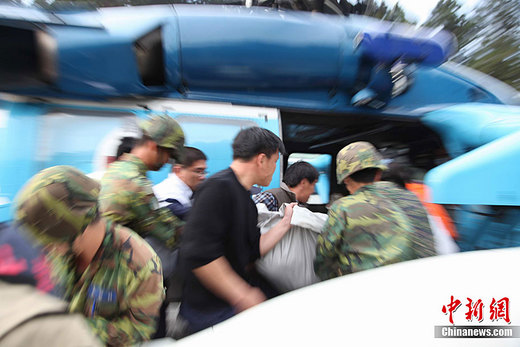 4月27日,臺灣阿里山景區發生小火車翻車事故,現場被當地警方封鎖。下午5點,最后兩個大陸游客遇難者遺體被抬上直升飛機。中新社發 沈存旭 攝
