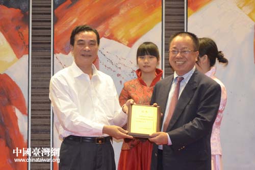 廣東省臺(tái)辦主任陳國(guó)興向新任會(huì)長(zhǎng)許朝財(cái)頒發(fā)證書(shū)。(圖片來(lái)源:陽(yáng)江市臺(tái)辦)