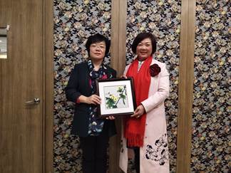 副市長、市鄉(xiāng)情聯(lián)誼交流團(tuán)長余鴻純向臺(tái)灣中國生產(chǎn)黨盧月香主席贈(zèng)送紀(jì)念品。