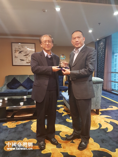中山市臺灣事務局局長林慶和(右)會見臺灣中山大學中國與亞太區域研究所林德昌教授(左)師生一行并互贈紀念品。(圖片來源:中山市臺辦)