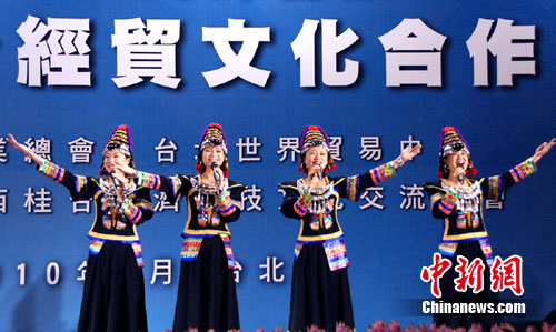 廣西壯族自治區(qū)黨委書記郭聲琨率領(lǐng)1000余人的廣西經(jīng)貿(mào)文化代表團(tuán)7月1日—7月5日在臺(tái)灣參訪,客家人聚居的廣西賀州市隨廣西團(tuán)一起赴臺(tái),廣西代表團(tuán)一項(xiàng)重頭戲活動(dòng)就是舉行桂臺(tái)經(jīng)貿(mào)文化合作論壇,賀州客家姑娘唱起客家山歌為活動(dòng)助興。作 者:廖祖平
