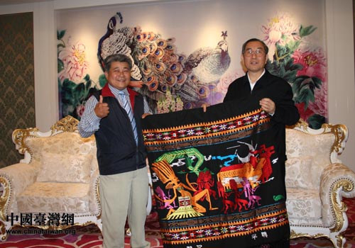 廣西壯族自治區(qū)主席馬飚(右)向臺灣花蓮農(nóng)民代表團贈送廣西壯族特色工藝品壯錦。(圖片來源:廣西臺辦)