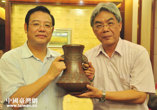 欽州市委副書記唐咸僅(左)向花蓮市贈送欽州坭興陶。(圖片來源:欽州臺辦)
