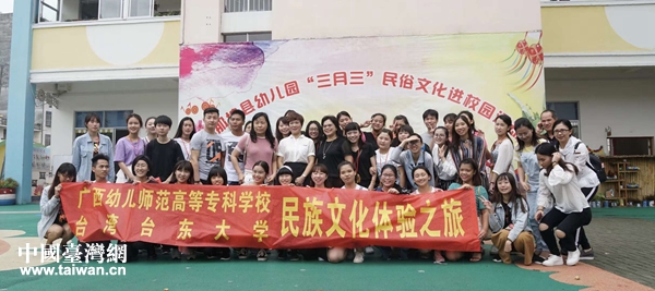中國臺灣網5月30日那坡訊 5月23日,臺灣臺東大學、廣西幼兒師范高等?茖W校師生一行60人到廣西那坡縣幼兒園開展桂臺師生民族文化體驗活動,考察那坡縣黑衣壯風情園,參觀和體驗那坡壯鄉特色少數民族民風民俗。