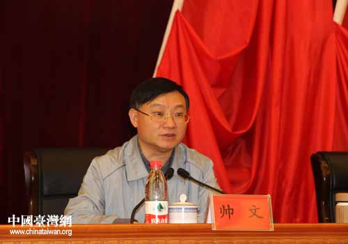 帥文充分肯定去年全市對臺工作,他指出,2011年,全市各級各部門和對臺工作系統(tǒng)認真貫徹中央對臺工作方針政策,推動對臺工作不斷創(chuàng)新發(fā)展,如成功舉辦“筑臺兩地中醫(yī)藥文化研討暨項目推介會”、“在臺筑籍新娘爽爽貴陽行”和“筑臺兩地書畫藝術(shù)交流展”等大型涉臺交流活動,完成《從陽明文化看筑臺情緣》專題片的拍攝和“貴陽市小河經(jīng)濟技術(shù)開發(fā)區(qū)系列報道”工作,為推動兩岸關(guān)系和平發(fā)展作出了積極貢獻。