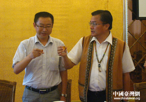 三都縣委副書記羅友軍給臺(tái)灣少數(shù)民族生存發(fā)展協(xié)會(huì)理事長(zhǎng)孔文吉敬酒。(黔南州臺(tái)辦 桂勇 攝)