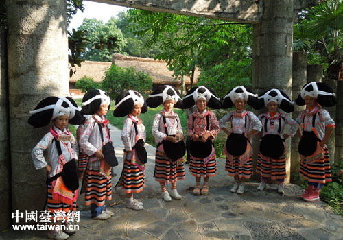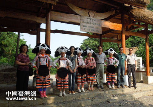 長角苗女孩在梭戛生態博物館大門前歡迎調研組一行。(圖片來源:六盤水市臺辦)