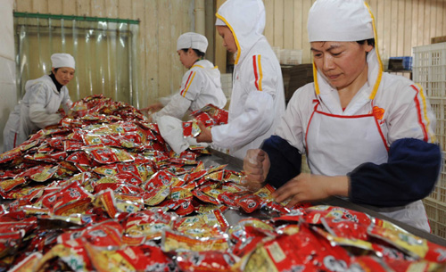12月27日,從廣東返鄉(xiāng)的農(nóng)民工龍開萍(右一)在貴陽(yáng)市南明區(qū)老干媽風(fēng)味食品有限公司工作。