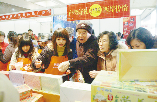 昨天,二八臺灣特色商品交易會及特色農產品展銷會在南京文化藝術中心舉辦。兩岸直航后,更多品種、更新鮮便宜的臺灣食品將走進南京市民家庭。圖為不少市民選購貨品,好像趕了一趟臺灣特色商品年貨“大集”。記者 葛 訊攝