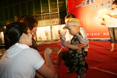 19:30分,晚會在歌手豆豆演唱的《龍的傳人》歌聲中拉開帷幕。天雖然下著雨,但止不住鎮江人民對臺灣同胞捐款的熱情,市政協副主席許能斌先生,鎮江市委副秘書長、市臺辦主任褚祎女士,市廣播電視局黨委書記、局長戈矛首先登臺帶頭捐款,十幾家企業和近百位市民也紛紛來到晚會現場進行募捐,募捐箱前從幾歲的孩童到年逾花甲的老人,一個個都默默奉獻出自己的一片愛心。
