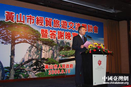 9月10日下午,黃山市在臺北王朝大酒店成功舉辦經(jīng)貿(mào)旅游招商推介會。臺灣雙電公會等30余家商業(yè)協(xié)會、臺灣春保鎢鋼集團(tuán)等90家企業(yè),臺灣東森電視臺等10家當(dāng)?shù)孛襟w應(yīng)邀到會。黃山市副市長徐健敏結(jié)合赴臺參加“合肥——臺北首航式”之機(jī)專程到場為推介會致辭,市長助理劉光、市旅委負(fù)責(zé)人作了招商、旅游推介,臺灣中華國際觀光協(xié)會理事長劉宗明、臺灣春保鎢鋼集團(tuán)董事長廖萬隆代表臺灣各界發(fā)言。中國國民黨黨主席吳伯雄、副主席蔣孝嚴(yán)、臺灣“立委”劉盛良等知名人士為本次活動贈送了花籃。