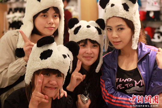 5月23日,來到臺(tái)北木柵動(dòng)物園熊貓館參觀的4位年輕臺(tái)灣女孩在熊貓紀(jì)念品店選購紀(jì)念品,并一起戴上熊貓帽子合影留念。隨著“團(tuán)團(tuán)”“圓圓”成為木柵動(dòng)物園里的動(dòng)物明星,大熊貓?jiān)谂_(tái)受熱捧,引來參觀客絡(luò)繹不絕。中新社發(fā) 羅欽文 攝