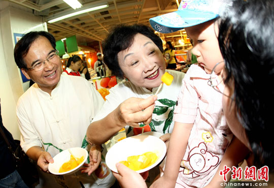 6月16日,臺灣臺南縣長蘇煥智一行專程來到北京的一家超市,為臺南縣的“旗艦品牌”水果愛文芒果開拓大陸市場。臺南縣是臺灣最大的農業縣市,被譽為“盛夏的紅寶石”的愛文芒果是臺南縣特有的品種。隨著兩岸農業領域的交流不斷深入,北京市民將會品嘗到更多的臺灣水果。