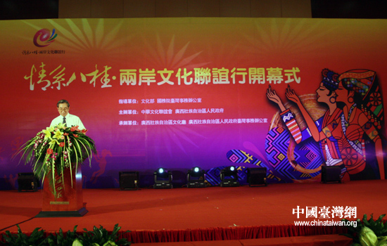 文化部副部長李洪峰在致辭時表示,廣西不僅風(fēng)光秀麗,美景如畫,而且人文厚瀚,民俗獨特,壯、瑤、苗、侗等少數(shù)民族文化多彩而絢麗,諸多富有廣西民族特色的文化藝術(shù)創(chuàng)作如民族音畫《八桂大歌》、山水實景演出《印象?劉三姐》等引領(lǐng)著大陸文化產(chǎn)業(yè)發(fā)展之先。相信通過為期10天豐富而充實的參訪、研討、交流、聯(lián)誼,“情系八桂”文化聯(lián)誼之旅定能引起臺灣嘉賓的共鳴。