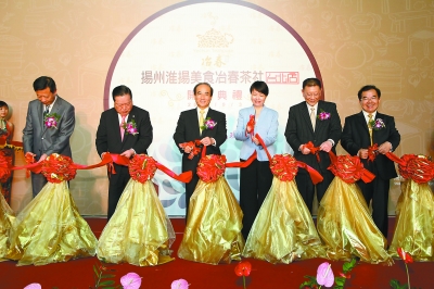 9月3日,淮揚(yáng)美食揚(yáng)州冶春茶社臺北店京華城開業(yè)。臺灣立法機(jī)構(gòu)負(fù)責(zé)人王金平等參加典禮。這是大陸國有資本入島投資實(shí)體項(xiàng)目的首例,也是大陸餐飲業(yè)在臺投資規(guī)模最大的項(xiàng)目。陳榮富 攝