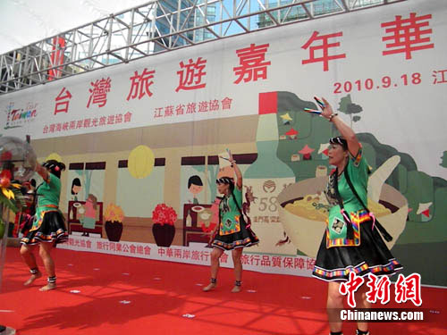 18日,臺(tái)灣海峽兩岸觀光旅游協(xié)會(huì)(簡稱臺(tái)旅會(huì))在南京舉行“臺(tái)灣旅游嘉年華”。這是臺(tái)旅會(huì)在大陸首度舉辦的戶外嘉年華推廣活動(dòng)。在此間上午的嘉年華盛會(huì)上,臺(tái)灣藝術(shù)家們熱情火辣的原住民歌舞表演,將現(xiàn)場氣氛推至高潮。