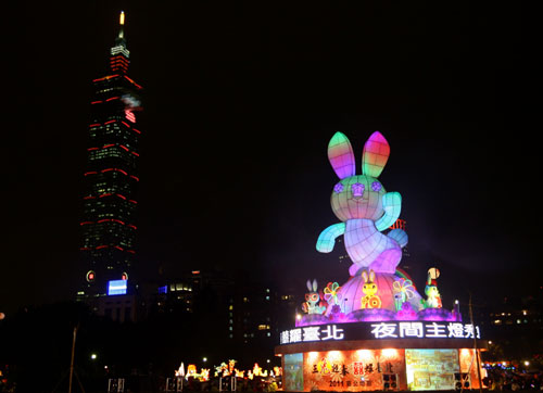 “2011臺北燈節(jié)”主燈“貝比”兔11日晚間正式點燈,搭配彩色鐳射水幕、水舞等表演,讓民眾欣賞絢麗的聲光主燈秀。圖片來源:“中央社”