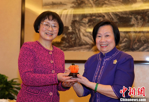3月22日上午,正在臺(tái)北參訪的上海婦女代表團(tuán)來(lái)到臺(tái)灣婦聯(lián)會(huì)辦公樓,拜會(huì)了海基會(huì)已故前董事長(zhǎng)辜振甫的遺孀、臺(tái)婦聯(lián)會(huì)主委辜嚴(yán)倬云女士。圖為辜嚴(yán)倬云(右)向張麗麗(左)贈(zèng)送南瓜造型工藝品。中新社發(fā) 符永康 攝