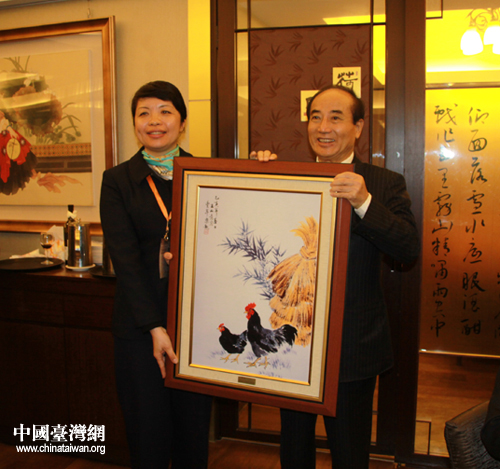 2011年4月18日,臺灣十大杰出青年基金會歡送大陸高校師生參訪團一行,圖為十大杰出青年基金會王金平董事長與中國宋慶齡基金會聯(lián)絡(luò)部陳愛民部長互換禮物。(中國臺灣網(wǎng) 楊永青 攝)