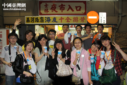 2011年4月10日,大陸高校參訪團的學(xué)生們前往臺北士林夜市品嘗特色小吃,在夜市入口處合影留念。(中國臺灣網(wǎng) 楊永青 攝)
