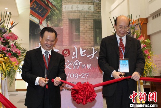 應(yīng)臺灣大學(xué)邀請,校長周其鳳率北京大學(xué)134人代表團(tuán)訪問臺灣,展開北大歷史上規(guī)模最大的校際交流活動,并于9日在臺大開展“北京大學(xué)日”系列活動。圖為周其鳳(左2)與臺大校長李嗣涔(左1)參觀展覽。中新社發(fā) 路梅 攝