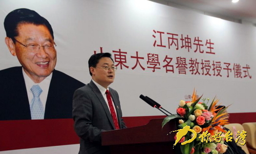 談到山東的經濟和發(fā)展,江丙坤先生描述了一個宏偉藍圖:“山東是經濟強省,同時也是人口大省、資源大省。臺商轉型后,將大力參與山東省的經濟發(fā)展。他表示,自己雖然已經退休,但仍然樂意為兩岸的交流盡一份力,本次受聘山東大學名譽教授,更讓自己感到平添了一份責任和義務;我作為山東大學一員,能為進一步促進臺灣各大學與山東大學的交流合作,能為山東經濟發(fā)展做出一份貢獻而感到特別榮幸。他同時也希望借此機會推動魯臺經貿合作,為魯臺文化交流貢獻一己之力,把實現(xiàn)中華民族的偉大復興作為目標,朝著這個目標一起努力!