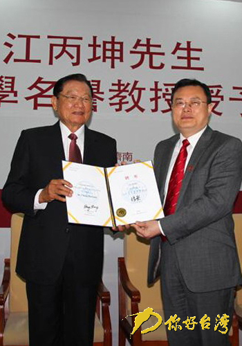 張榮校長在儀式上向江丙坤先生頒授聘書(你好臺灣網(wǎng) 圖)