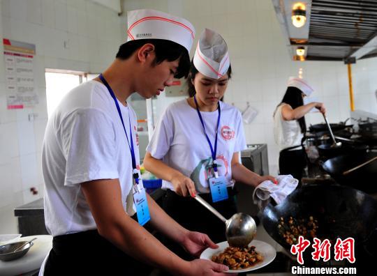 中新網(wǎng)成都7月23日電 (付敬懿 安源)“這盤菜取名百年修得同船渡,象征著臺灣和大陸同學(xué)的友誼。”指著面前的剁椒茄子,臺灣淡江大學(xué)的林書耘說,川菜體驗營里四天的相處,讓他與四川的大學(xué)生建立起深厚的友誼。23日,20名川臺兩地大學(xué)生頭戴白色廚師帽,腰系黑色圍裙,在四川旅游學(xué)院教室里以廚會友,展開一場“我是廚師我最牛”的廚藝比賽。同學(xué)們先要完成宮保雞丁、鐘水餃兩個指定菜肴,再利用廚房的各類食材,自由發(fā)揮做出三道美食。