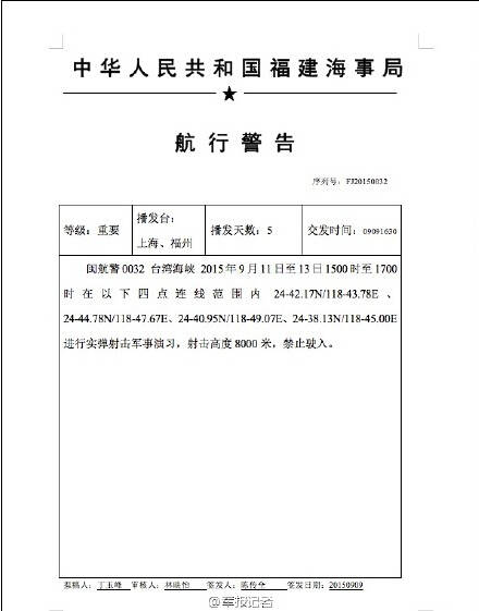 據中國海事局網站消息,解放軍9月11日至13日15時至17時在臺灣海峽以下四點連線范圍內24-42.17N/118-43.78E、24-44.78N/118-47.67E、24-40.95N/118-49.07E、24-38.13N/118-45.00E進行實彈射擊軍事演習,射擊高度8000米,禁止駛入。