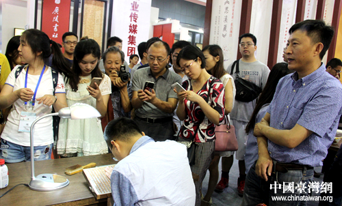 海外臺灣留學(xué)生長三角研習(xí)營營員們參觀了第六屆江蘇書展,觀看雕版印刷。(中國臺灣網(wǎng)記者 李杰 攝)
