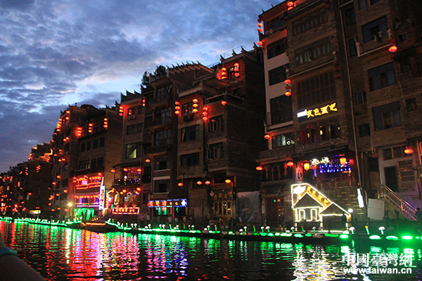 此時的舞陽河,岸上燈光搖曳,水面波光粼粼,輕風徐徐吹來,岸上的吊腳樓上傳來斷斷續(xù)續(xù)的樂聲與歡笑,游船壓碎兩岸倒映在水面的五彩燈火前行,別有一番情韻。