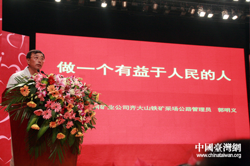 郭明義做以“做一個有益于人民的人”為主題先進事跡報告。(中國臺灣網 郜利敏 攝)