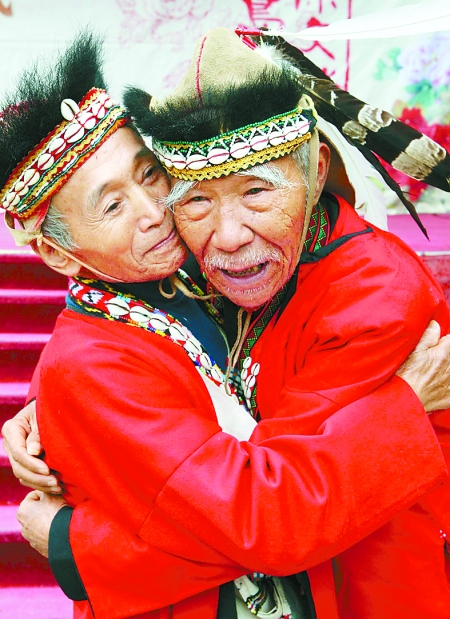 12月18日,參加“中原文化寶島行”的徐光春一行來到了阿里山鄉特富野社區,鄒族頭目汪念月(左)及社區全體村民一起歡迎遠方的客人。記者 陳偉 攝