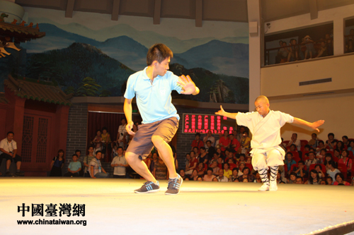 在互動表演環(huán)節(jié),來自臺灣嘉義大學(xué)學(xué)生陳逸瓏和陳彥百上臺進行模仿表演武術(shù)。雖然兩位同學(xué)并未完整地將動作做下來,但他們勇敢登臺表演、展現(xiàn)自身的表現(xiàn),贏得大家的陣陣掌聲。表演完后,陳逸瓏說,自認(rèn)為有一定的身體素質(zhì),但真正要按照少林武僧的要求去做,真是太難了,差距也太大了,少林武功好個厲害。