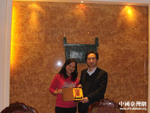 安陽市副市長姜海軍向王麗芬女士贈送甲骨文片紀念品。圖片來源:安陽臺辦