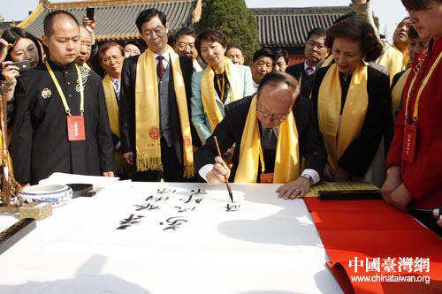 蔣孝嚴在黃帝故里祠前題詞“尋根溯源 萬流歸宗”。(圖片來源:河南省臺辦)