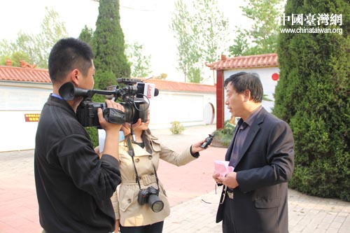 記者采訪南陽謝氏宗親聯誼會會長謝文普。(圖片來源:河南省臺辦)