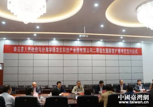 中國臺灣網4月20日南召訊 4月18日上午,南召縣人民政府與臺灣華揚龍生科技產業園有限公司舉行二期益生菌酵素擴建項目簽約儀式,南召縣相關領導,臺灣華揚龍生科技產業園董事長許正郎、總經理李恒等出席簽約儀式。