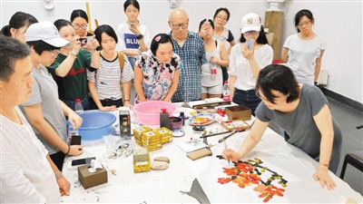 圖為臺灣畫家劉蓉鶯(右一)為兩岸學(xué)生示范花鳥畫技法。(張盼 攝)